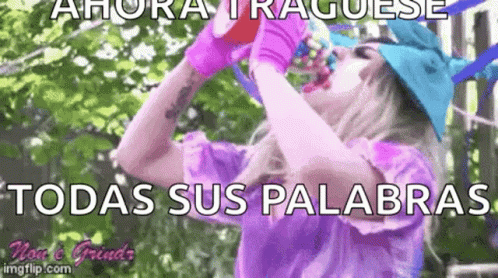Person drinking colorful candy from a bottle with the meme text 'Ahora Tráguese Todas Sus Palabras' (Now Swallow All Your Words).