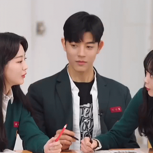 Park Solomon from All Of Us Are Dead having a playful moment with castmates, reacting to a question.