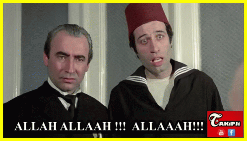 Kemal Sunal and Şener Şen react with wide-eyed surprise, exclaiming 'Allah Allah Allah' in a classic Turkish film scene.