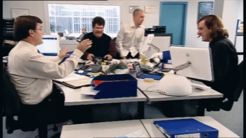 In an office, a man declares everyone is crazy, leading to a dramatic scream from another colleague.