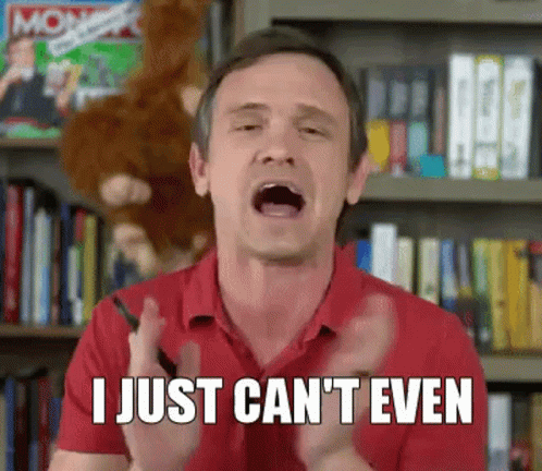 Allenxandria expresses frustration with 'I just can't even' gesture in front of a bookshelf.