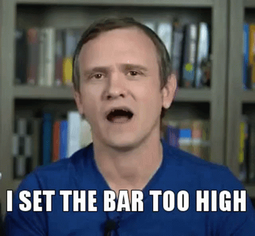 Allenxandria states 'I set the bar too high' in front of a bookshelf, expressing a common sentiment.