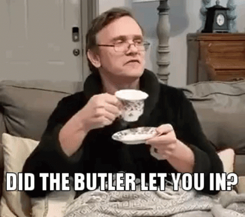 Allenxandria Posh Allen, a man in a robe, sips tea and asks, 'Did the butler let you in?'