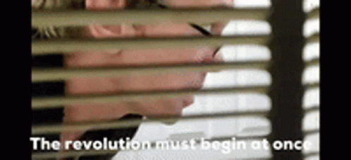 A man looks intently through window blinds, with the text 'The revolution must begin at once' displayed.