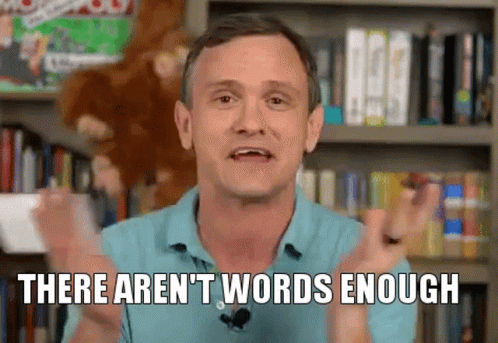 Allenxandria says 'There aren't words enough' while gesturing in front of a bookshelf.