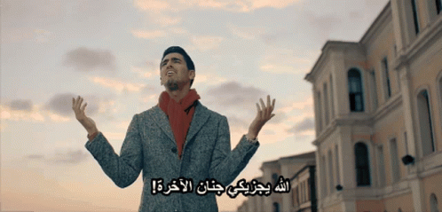 Humood Al Khudher looks up with arms open, expressing a prayer or blessing, with Arabic text 'May God reward you'.