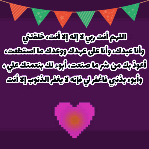 A powerful Islamic prayer (Sayyid al-Istighfar) on a purple background with a blue pixelated heart.