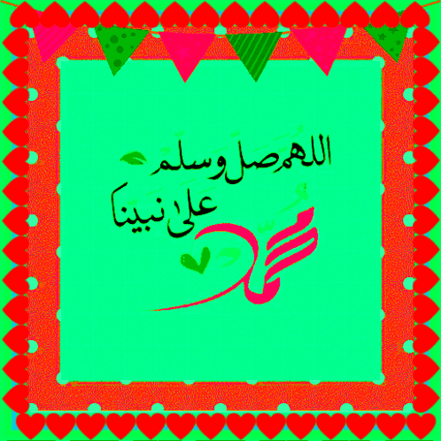 Arabic calligraphy of 'O Allah, send prayers and peace upon our Prophet Muhammad' on a green background with a heart border.