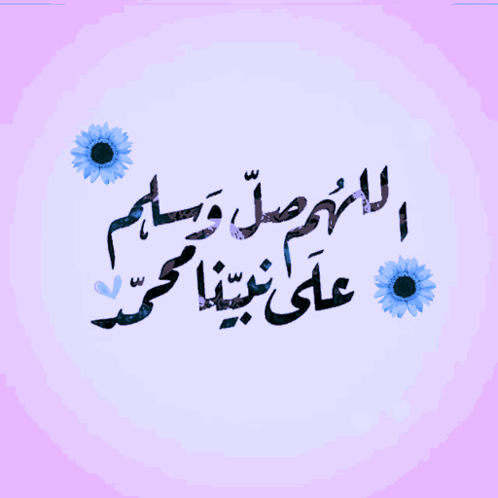 Arabic calligraphy 'O Allah, send prayers and peace upon our Prophet Muhammad' on a pink background with blue flowers.