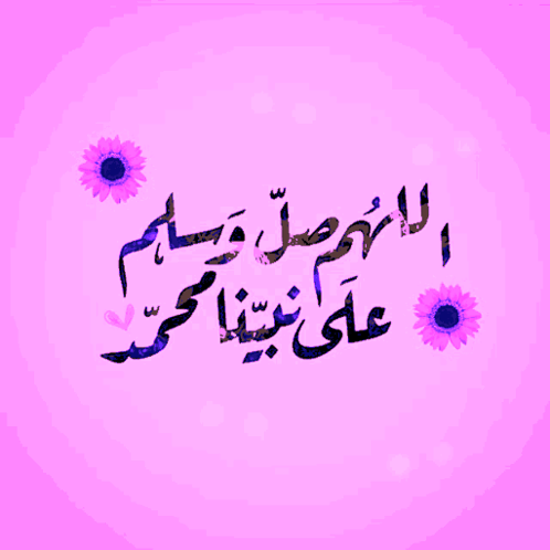 A vibrant pink background featuring beautiful Arabic calligraphy, 'O Allah, send prayers and peace upon our Prophet, peace be upon him,' adorned with purple flowers.