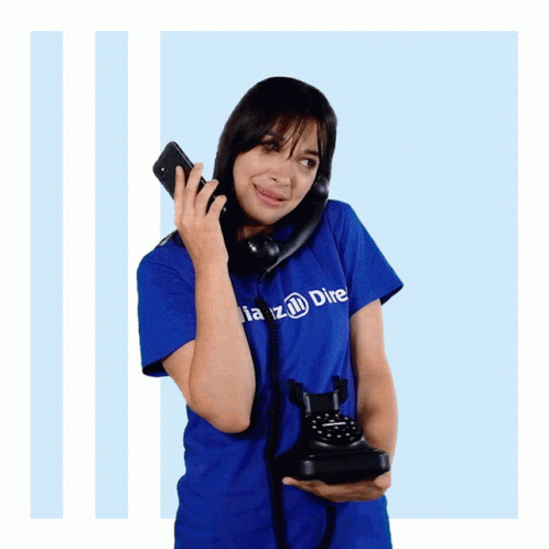 Woman in Allianz Direct shirt looks frazzled, juggling a modern smartphone and an old rotary phone.