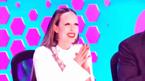Allie X smiling and clapping enthusiastically as a guest judge on Canada's Drag Race, with a vibrant background.
