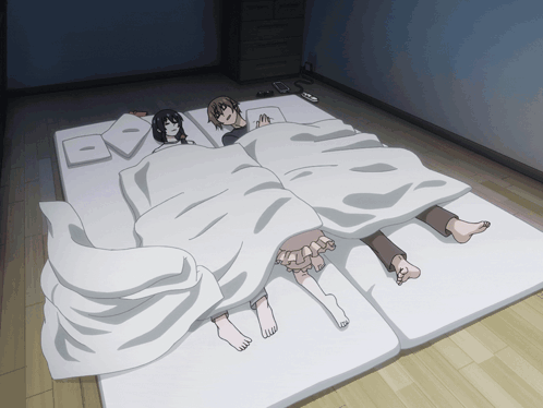 a couple laying on a bed with their feet sticking out of the covers