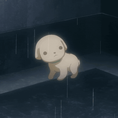 a small dog is standing in the rain looking at the camera