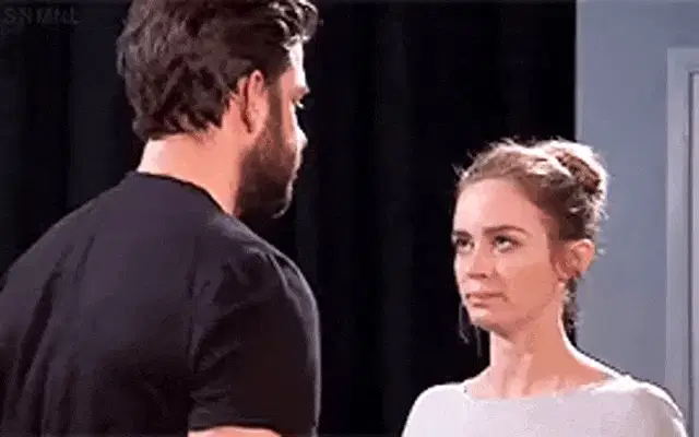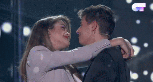 Almaia and Tucancion share a romantic embrace on stage, looking into each other's eyes.