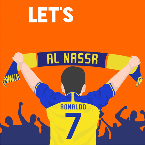 Ronaldo in Al Nassr jersey with 'Let's Go Nassr!' message, cheering for the team.