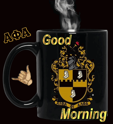 A black Alpha Phi Alpha fraternity mug with its crest and 'Good Morning' message, steaming hot.