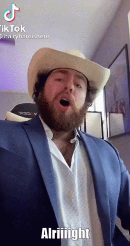 A bearded man in a cowboy hat and blue suit says 'Alright' with a confident expression.