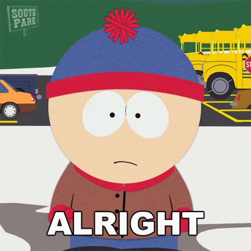 Stan Marsh from South Park says 'Alright' while standing in front of a school bus.