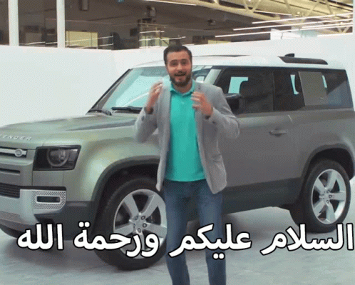 Man in a blazer greets viewers in front of a Land Rover Defender car in a modern showroom.