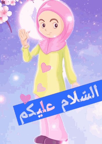 An animated girl in a pink hijab waves, with "As-salamu alaykum" appearing on screen.