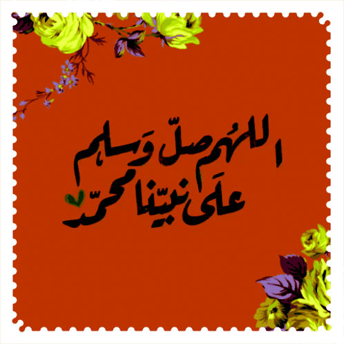 A vibrant red stamp-like image with Arabic calligraphy 'O Allah, send prayers and peace upon our Prophet Muhammad' framed by flowers.