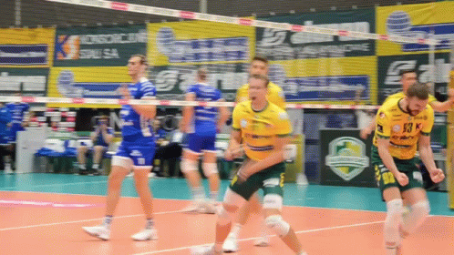 Aluron CMC Warta Zawiercie volleyball players celebrate a point during a PlusLiga match with great joy.