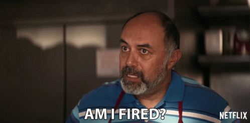 A man from Gentefied with a beard looks surprised and asks, "Am I fired?" expressing concern about his job.