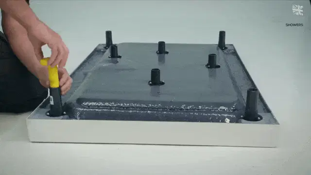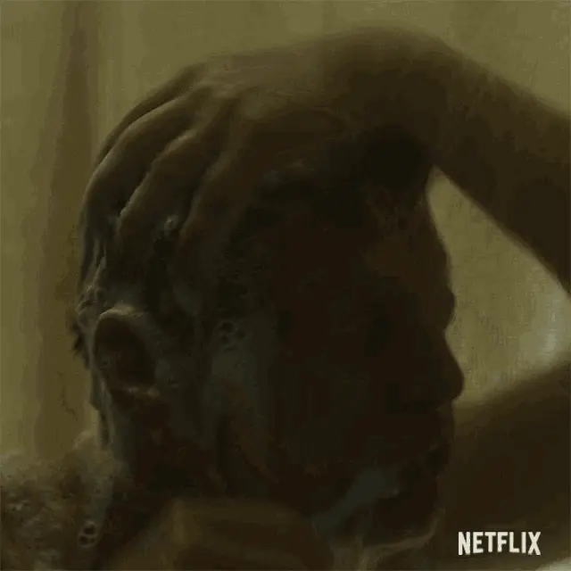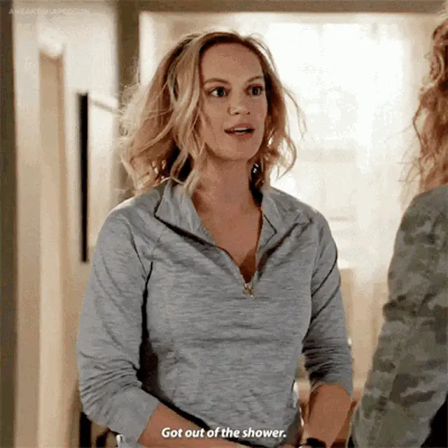 Joicy Eleiny applies hair conditioner to her wet, curly hair in the shower, looking at the camera with a smile.