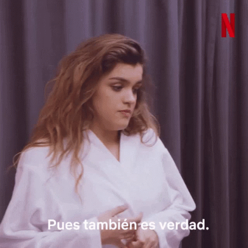 Amaia in a white robe, saying 'Pues también es verdad' in a clip related to Netflix's Paquita Salas.