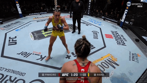 a woman in a yellow shorts is fighting another woman in a red shirt