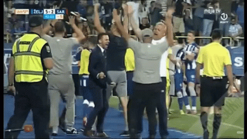 Amar Osim passionately celebrates a significant football victory, with the scoreboard showing Željezničar 5-2 Sarajevo.