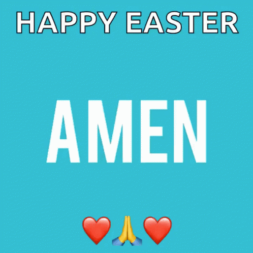 A vibrant graphic displaying 'Happy Easter Amen' and 'Es Bueno' with heart and praying hands emojis.