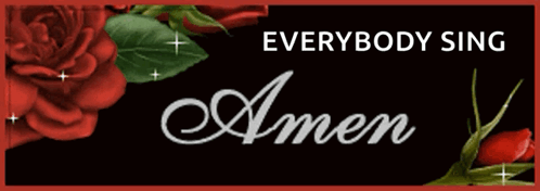 The word 'Amen' sparkles on a black background, adorned with vibrant red roses.