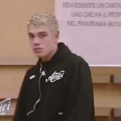 Biondo from Amici17 shows an angry reaction while standing in a room with Italian text.
