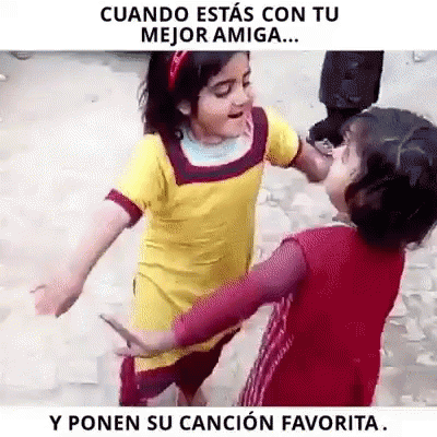 Two little girls joyfully dancing and playing together, sharing a happy moment outdoors.