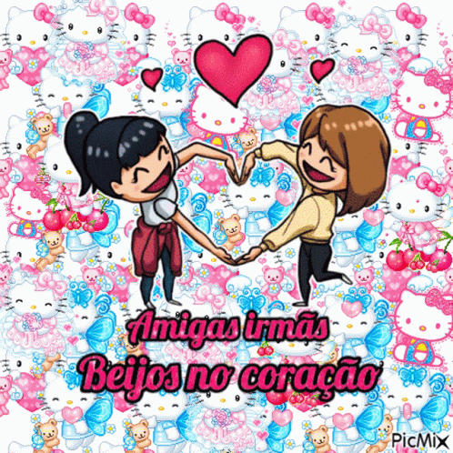 Two cartoon girls form a heart with their hands, surrounded by Hello Kitty and cherubs, with a message of sisterly friendship.