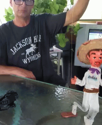Man in Jackson Hole Wyoming shirt holds a dancing cowboy puppet, bringing the 'Amigo' to life.