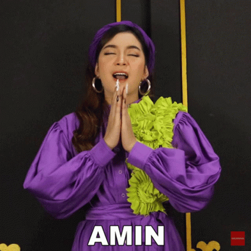 Amin Kania, wearing a purple dress and green ruffled scarf, offers a prayer with a smile.