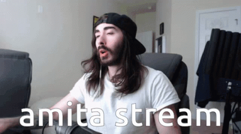 Cr1TiKaL, also known as MoistCr1TiKaL, reacting to an "amita stream" with an expressive face and gestures.