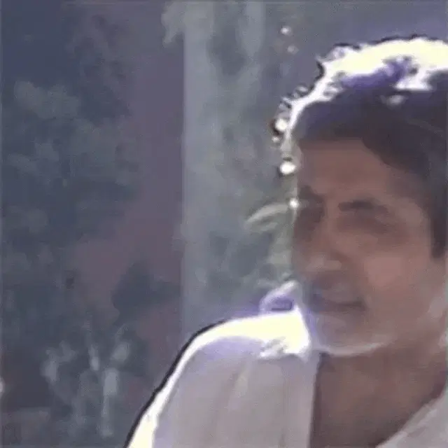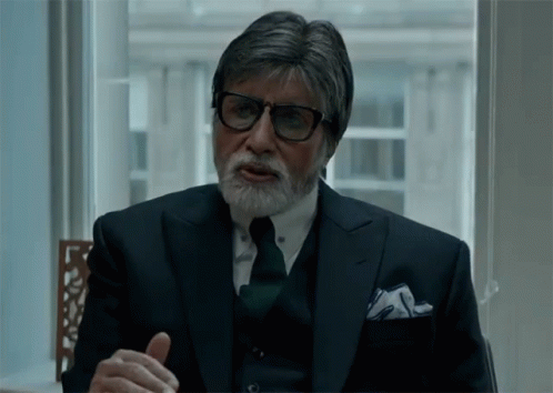 Amitabh Bachchan from Badla, wearing a suit and glasses, speaks and gestures intently.