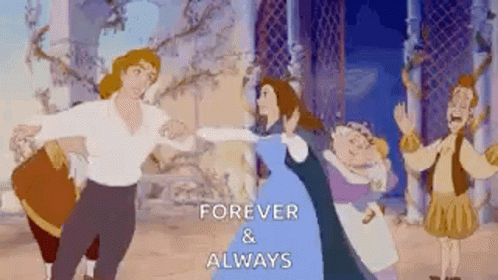 Belle and the Prince share a romantic dance in the castle ballroom, celebrating their 'Forever & Always' love.