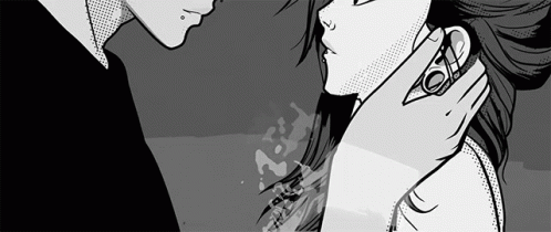 Konai and João Vitor share an intense, loving gaze in this black and white animated scene.