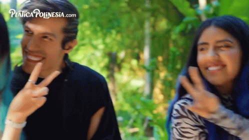Karen Polinesia and a man give peace signs, smiling brightly with a green background and 'Plática Polinesia' branding.