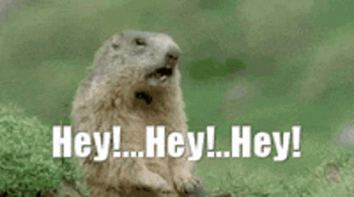 Amy the groundhog stands upright in a field, calling out 'Hey! Hey! Hey!' with its mouth open.