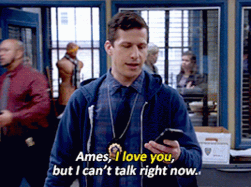 Jake Peralta, holding a phone, tells Amy Santiago "I love you, but I can't talk right now."