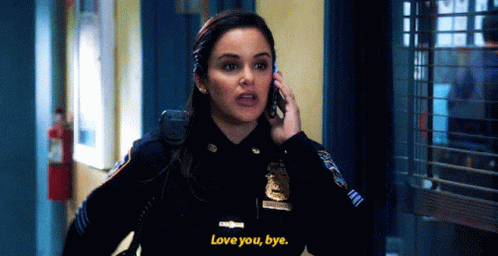 Amy Santiago (Melissa Fumero) in police uniform on phone, saying 'Love you, bye' in a hallway.