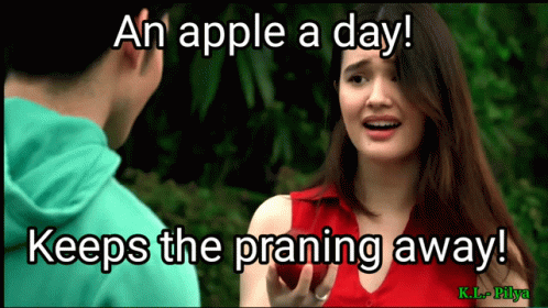 Kira and Grae share a funny moment with an apple, humorously stating 'An apple a day keeps the praning away!'