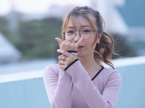 A young woman performs a clever eating finger magic trick, making her finger disappear and reappear with a smile.