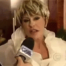 Ana Maria Braga gives an interview, speaking into a microphone while wearing a white ruffled top.